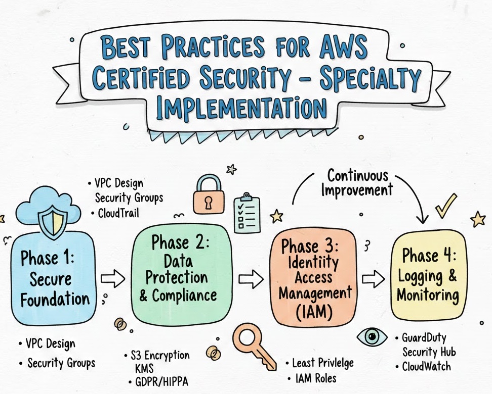 - Review AWS Security Fundamentals: Familiarize yourself with core concepts like IAM, VPC, encryption, and security monitoring.