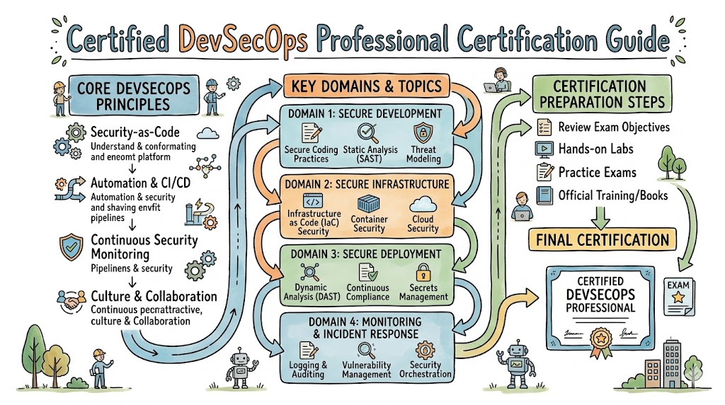 Certified DevSecOps Professional is a solid step if you want to move from “security as an add-on” to “security as a built-in” part of your DevOps work. It gives you the skills to design and run secure CI/CD pipelines, protect containers and infrastructure, and collaborate smoothly between development, operations, security, and leadership.When you combine this certification with broader programs like Master in DevOps Engineering and role-focused paths in SRE, AIOps/MLOps, DataOps, and FinOps, you create a long-term career roadmap that is both deep and flexible. Use the preparation plans, role mappings, and training institution options in this guide to plan your next 30–60 days of learning and then adjust as you gain experience in real projects.