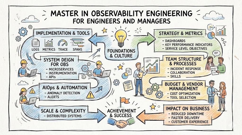 “Master” here means comprehensive coverage of observability from foundation to advanced topics, not just a short overview. It is designed to prepare you for system‑level responsibility rather than tool‑only tasks.